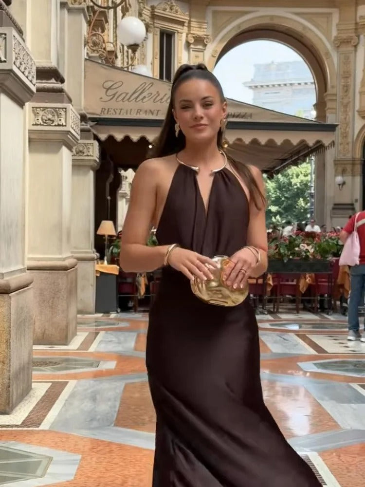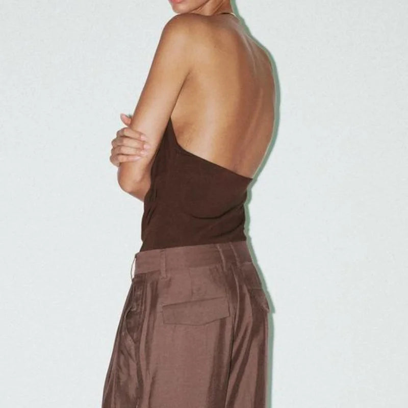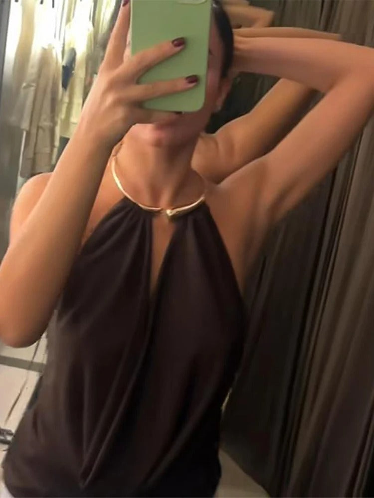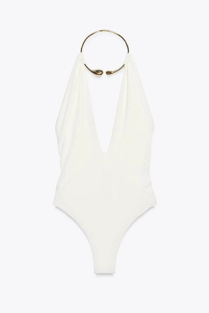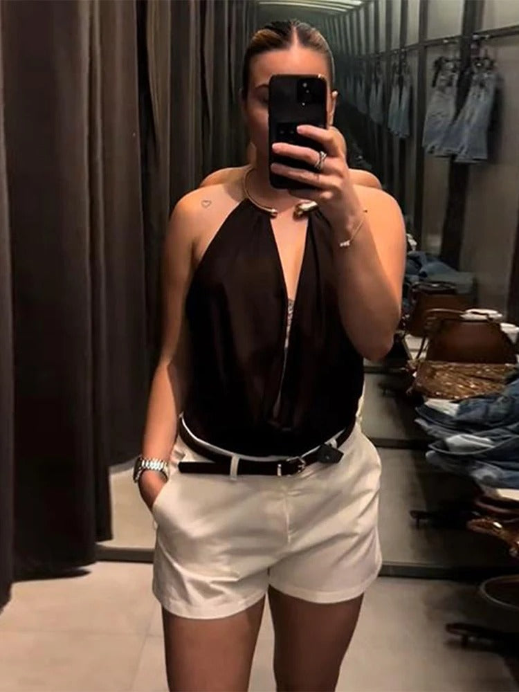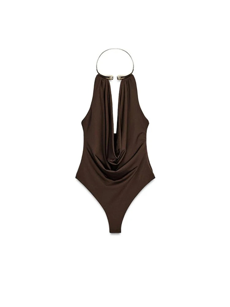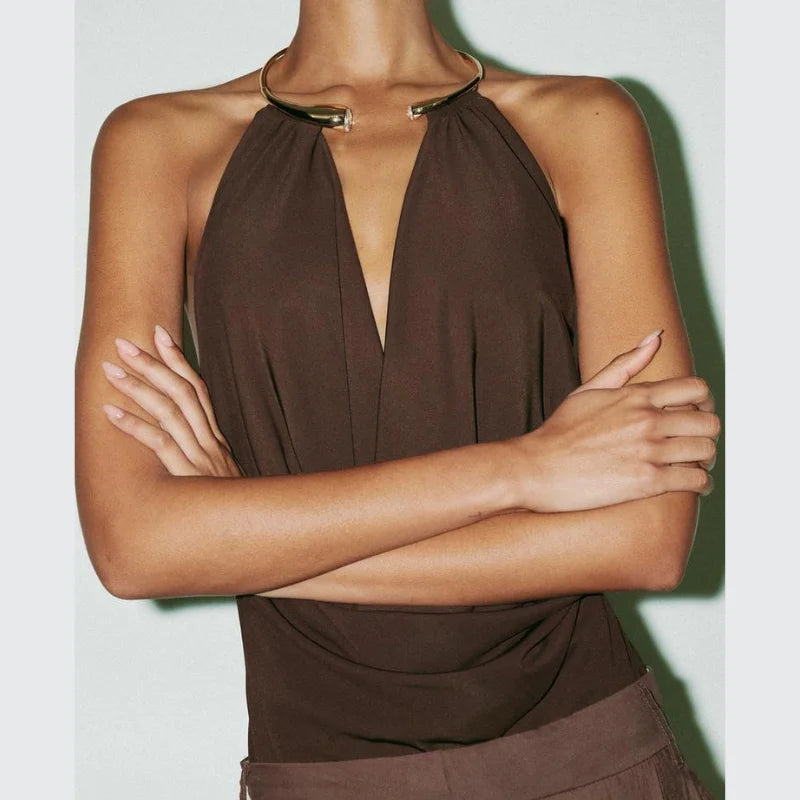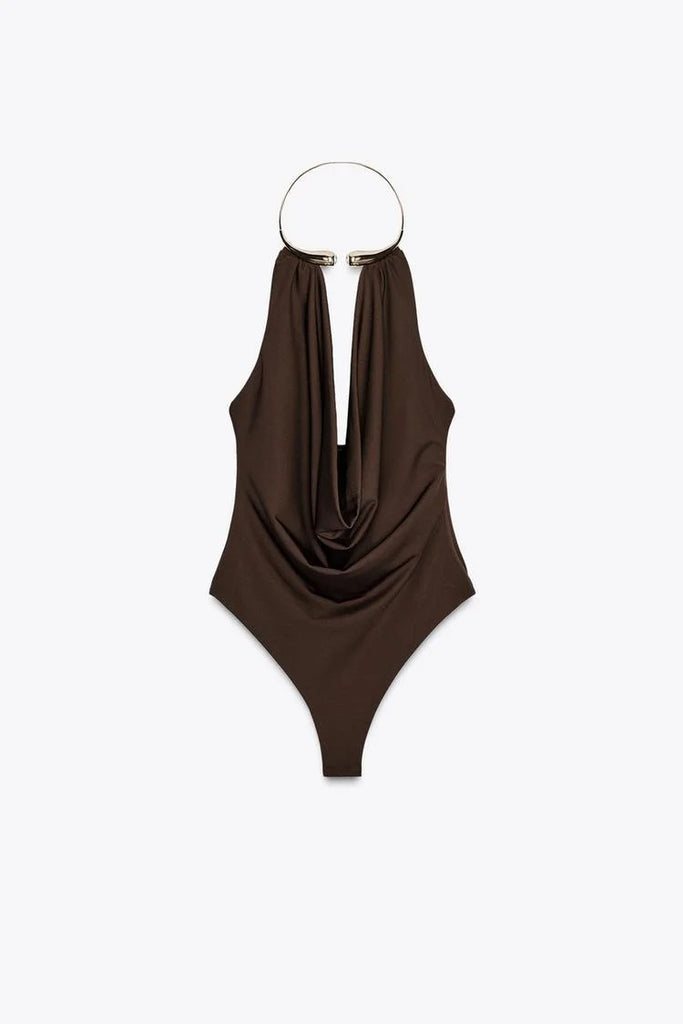 Body com decote drapeado profundo e detalhe de argola metálica no pescoço, criando um visual elegante e marcante. O tecido possui toque macio e leve brilho, garantindo caimento perfeito e valorizando o corpo sem perder o conforto.