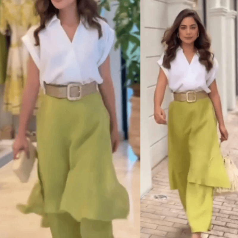 O Conjunto Jade é sinônimo de frescor e elegância natural. Composto por uma blusa de corte leve e fluido combinada a uma calça assimétrica em tom de verde-limão, ele cria um visual moderno e sofisticado. Ideal para dias ensolarados, passeios ou eventos diurnos, o Conjunto Jade une conforto, estilo e personalidade em uma peça que exala charme e feminilidade.